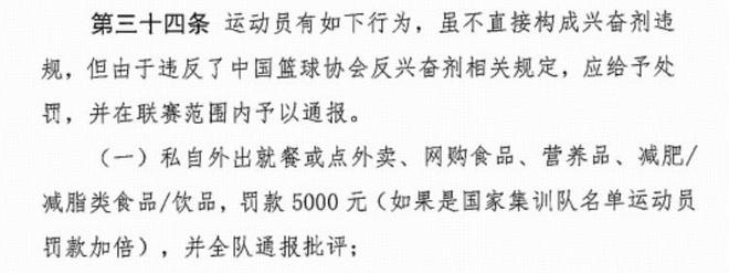 而第三十四條處罰方法中明確指出,私自外出就餐或點外賣、網(wǎng)購食品、營養(yǎng)品、減肥/減脂類食品/飲品,罰款5000元(如果是國家集訓(xùn)隊名單運動員罰款加倍),并全隊通報批評。